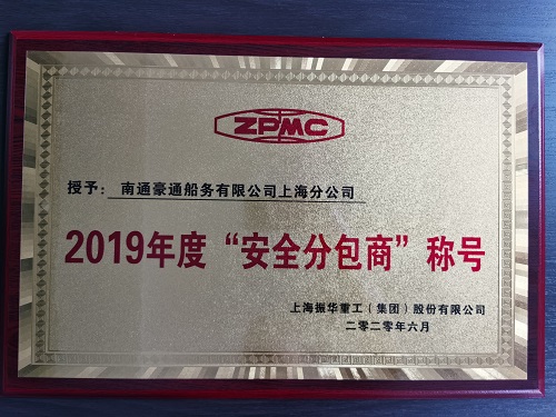 南通豪通船務(wù)上海分公司獲上海振華重工2019年度“安全分包商”稱號
